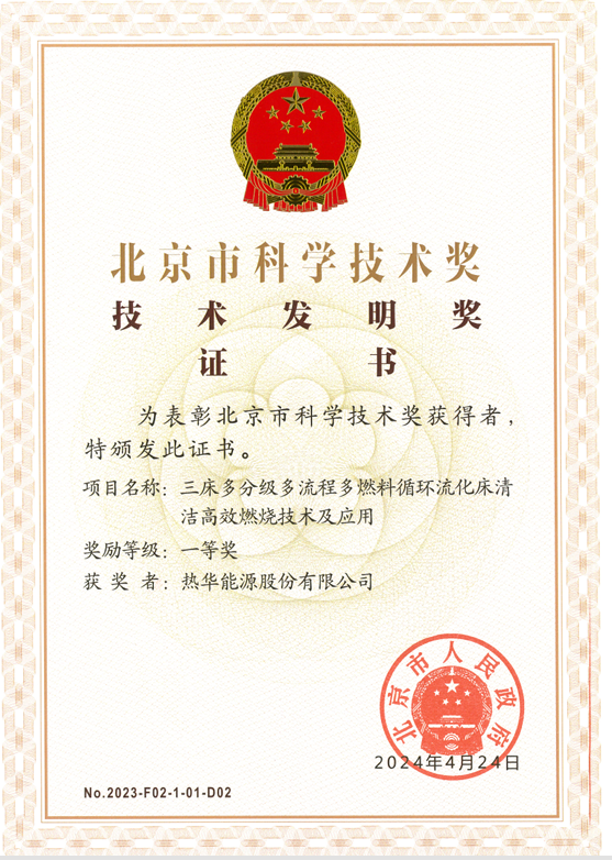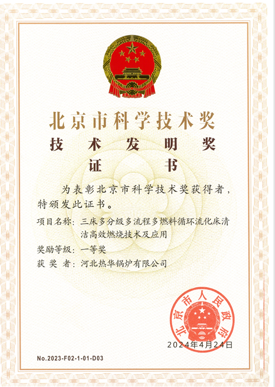 熱華能源股份有限公司和河北熱華鍋爐有限公司參與申報的“三床多分級多流程多燃料循環(huán)流化床清潔高效燃燒技術(shù)及應(yīng)用” 成果榮獲2023年北京市技術(shù)發(fā)明獎一等獎。